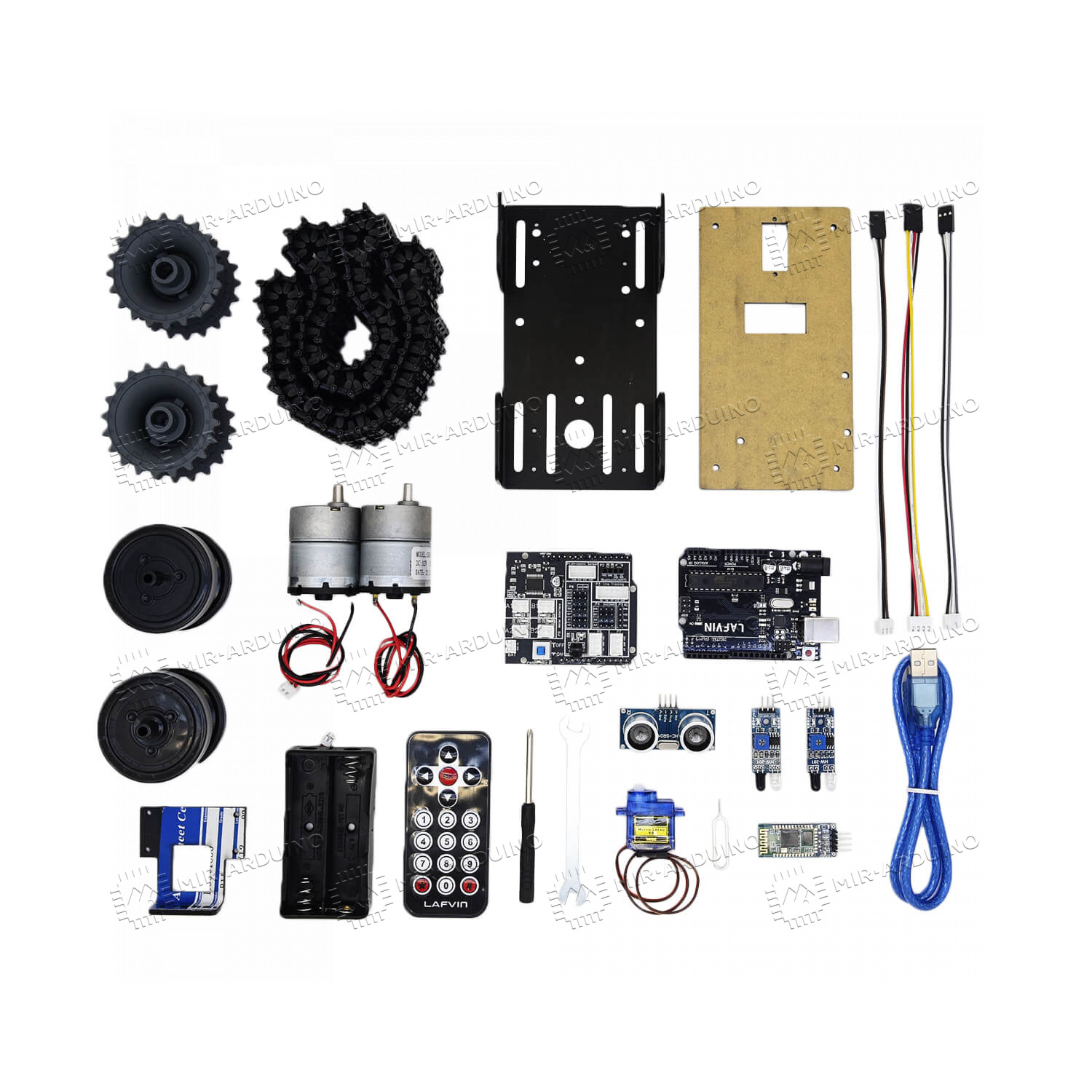 Набор для моделирования Ардуино (Arduino) Tank Robot Lafvin – умный конструктор для проектирования робота-танка. Комплект не требует использования паяльника, подойдет для детей и начинающих робототехников. Собранный робот будет передвигаться по заданной траектории, объезжать препятствия. Управлять танком можно с телефона, для синхронизации используется Bluetooth модуль. Набор включает в себя элементы корпуса робота, двигатель, датчики, провода, аккумулятор, пульт управления, зарядный кабель.